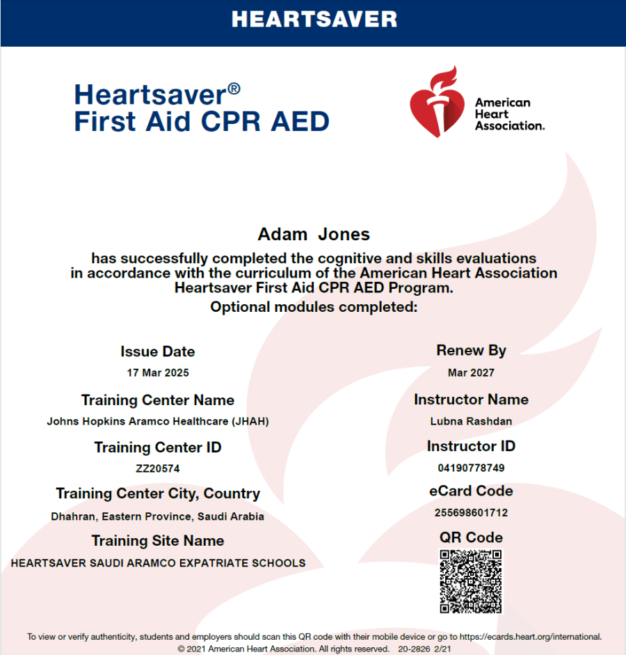 Heartsaver CPR student card